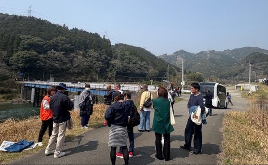 豪雨で流失した相良橋や、渡小学校の千寿園跡地などを巡り、参加者の皆様は現地で語り部の方による貴重なお話に耳を傾けました 。